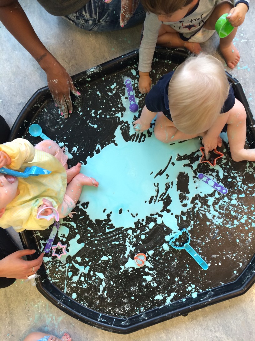 This is a very cleverly-devised mess, though, which is both tactile and thought-provoking. “It’s about a sensory experience,” Leanne tells me. As well as being lots of fun, she explains, the sessions are educational. The textures and colours encourage language development as the child and the parent discuss what they are discovering. They can also develop their fine motor skills as they explore the materials or do a bit of maths as they measure, count and sort. Activities sometimes even have a science aspect. Leanne tells me about when they made Rainbow Ice, where the children sprinkled salt on the ice and watched how it made it crack, before adding drops of food colouring to create beautiful coloured layers.
