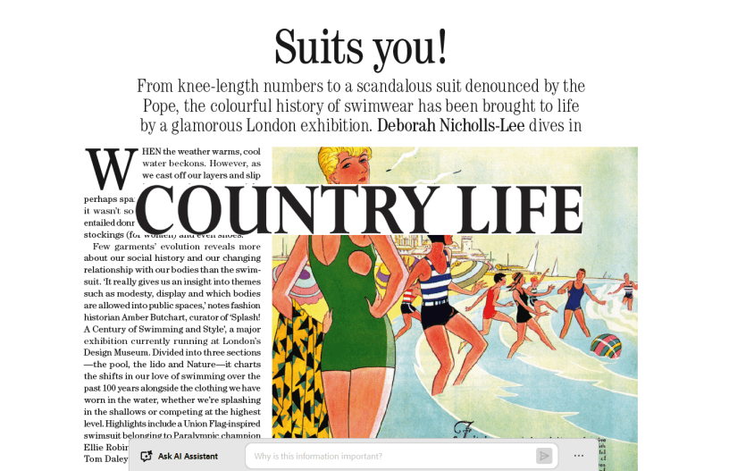 Feature written for Country Life Magazine on the history of swimwear with reference to Splash! A Century of Swimming and Style at London’s Design Museum.