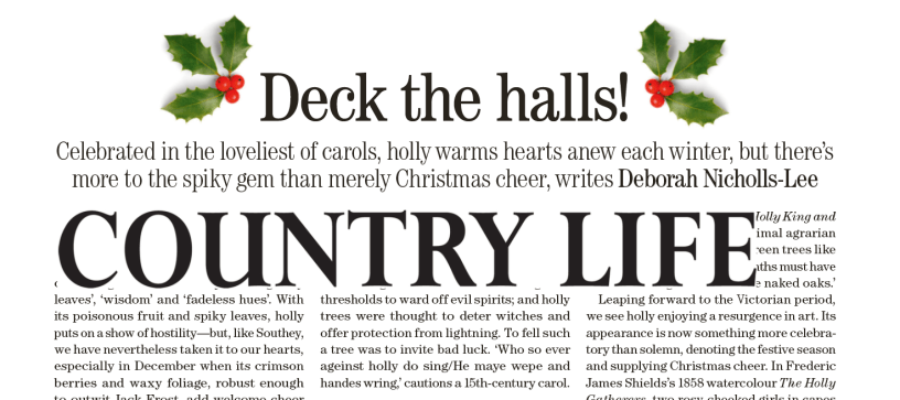Celebrations and Festivals, Culture, History, Nature, Rural life Deck the halls! Date: December 16, 2025Author: Deborah Nicholls-Lee Feature written for Country Life Magazine Christmas issue 11/17 December 2025 http://www.countrylife.co.uk CLI539.holly_lowresDownload Share this: Click to share on X (Opens in new window) X Click to share on Facebook (Opens in new window) Facebook Like Loading...